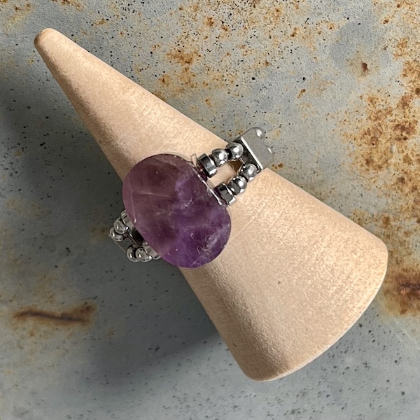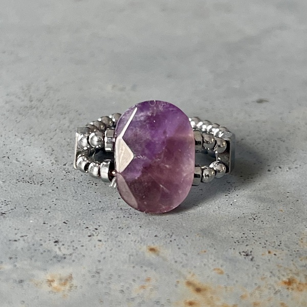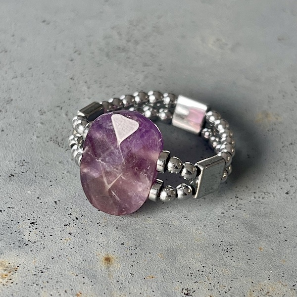 Bague double élastique, perle facettée 8 x 10 mm en améthyste chevron et petites perles rondes 2 mm en hématites argentée. Très agréable à porter. Choisissez la taille qui correspond à la mesure du tour de votre doigt. La pierre de la photo est celle que vous recevrez à votre taille…