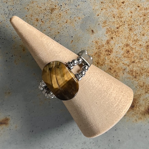 Bague double élastique, perle facettée 8 x 10 mm en oeil de tigre et petites perles rondes 2 mm en hématites argentée. Très agréable à porter. Choisissez la taille qui correspond à la mesure du tour de votre doigt. La pierre de la photo est celle que vous recevrez à votre taille…