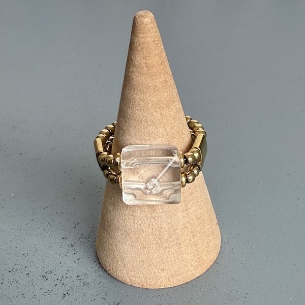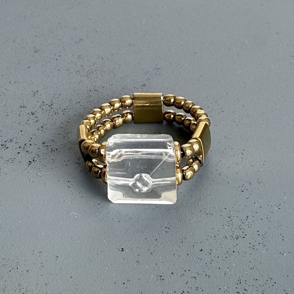 Cette bague double, montée sur un fil cristal élastique souple et résistant, est conçue sans aucun élément métallique, ce qui la rend idéale pour les peaux sensibles. Elle se compose d’une perle facettée en quartz (8 x 13 mm), accompagnée de petites perles rondes en hématite dorée (2 mm), pour un rendu à la fois délicat, élégant et énergisant.