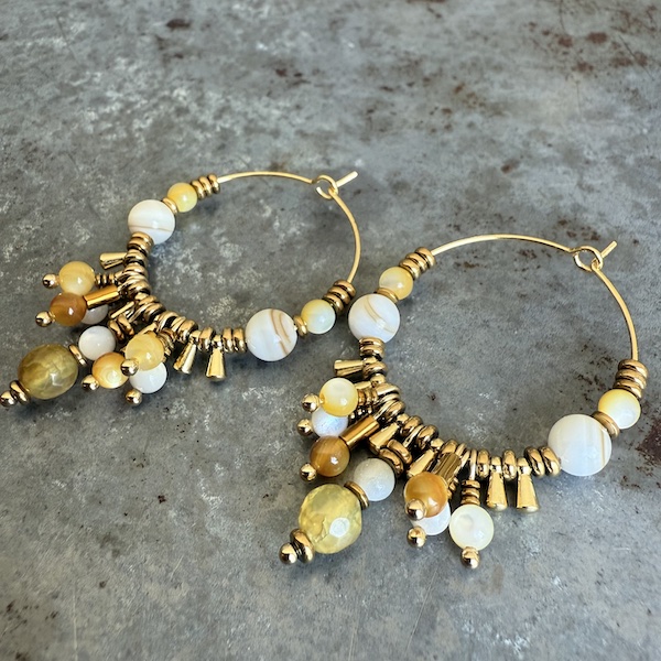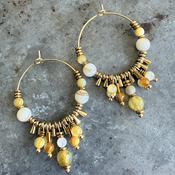 Succombez à la douceur lumineuse de ces boucles d’oreilles créoles plaquées or, où la délicatesse des perles en coquillage jaune et en nacre s’harmonise à l’éclat subtil des rondelles en hématite dorée. Une pièce unique, légère et raffinée, parfaite pour illuminer votre style d’une touche de nature et de poésie bohème chic.
