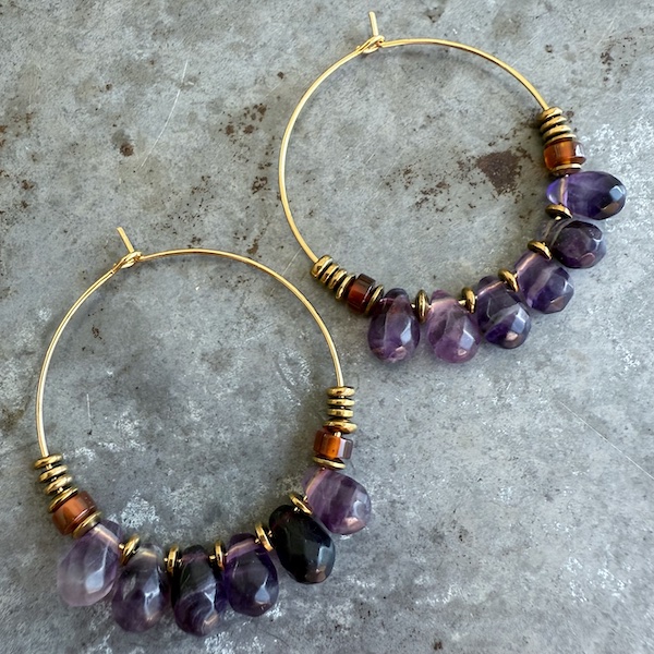 ✨ Boucles d’oreilles Créoles en Améthyste, Cornaline & Hématite Dorée – Éclat Bohème Chic ✨