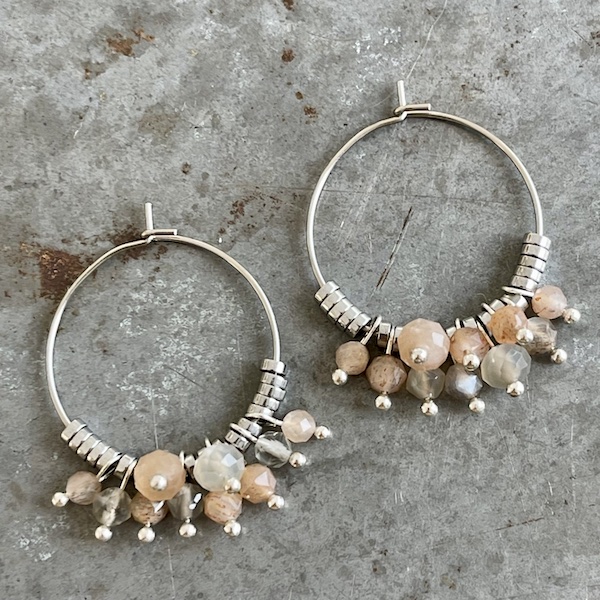 Boucles d’oreilles créoles en acier chirurgical argenté, perles en pierre de lune multicolore facettée et rondelles en hématite argentée. Très légères à porter!