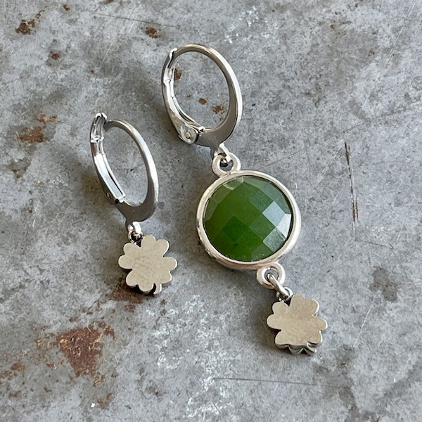 Pendentifs trèfle en acier chirurgical argenté et fuschite facettée. Longueur totale avec attaches: 3,7 cm pour la plus longue et 2,2 cm pour la plus courte.