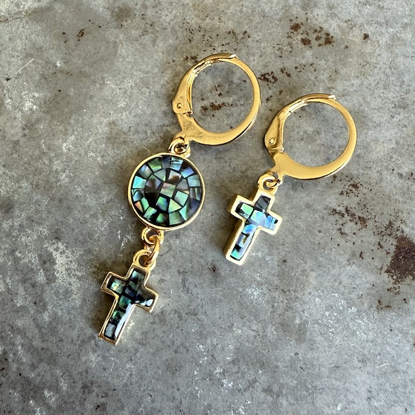 Boucles d’oreilles asymétriques en acier chirurgical plaqué or, croix en ormeaux bleus. Longueur: 4 cm pour la plus longue, 2,5 cm pour la plus courte. Très moderne et légères.