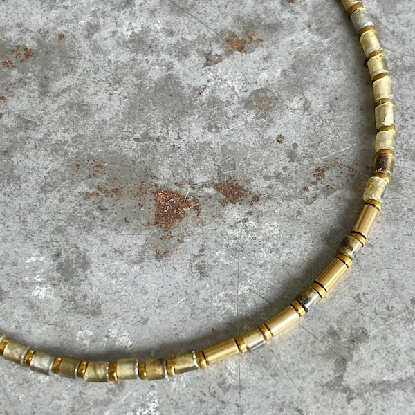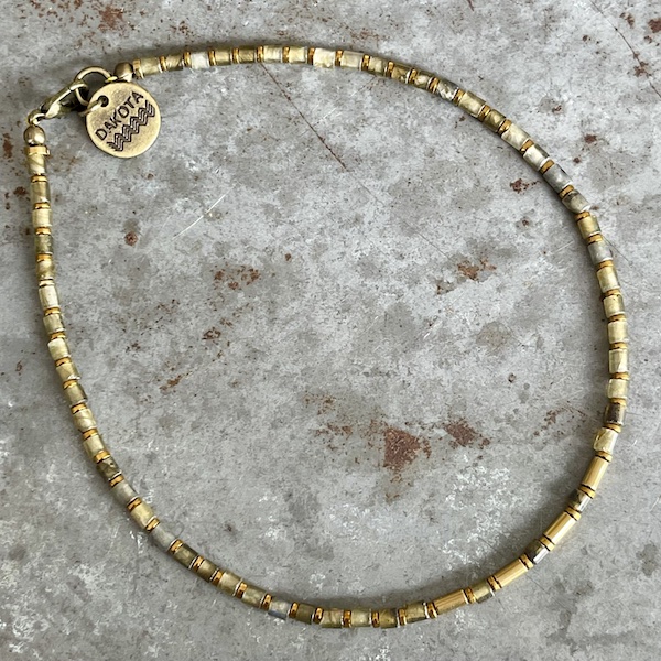Bracelet de cheville en labradorite, perles cylindriques 2 mm, cylindres et rondelles en hématite dorée.