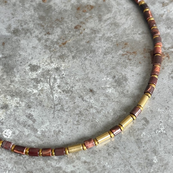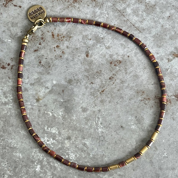 Bracelet de cheville en oeil de tigre rouge, perles cylindriques 2 mm, cylindres et rondelles en hématite dorée.