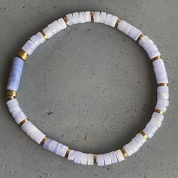 Bracelet en agate dentelle bleue, perles  rondelles 4 x2 mm, cylindre 1,3 cm en agate dentelle bleue et rondelles en hématite dorée.