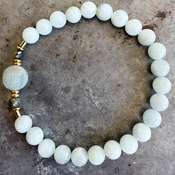 Ce bracelet artisanal, soigneusement conçu dans mon atelier de Voiron, en Isère, est une pièce unique qui incarne l’élégance naturelle et l’authenticité du style bohème chic. Il marie harmonieusement des perles rondes de 6 mm en aigue-marine, un palet facetté de 1 cm en aigue-marine, des perles carrées facettées de 4 mm en chrysocolle, et des rondelles en hématite dorée, pour une composition à la fois lumineuse, apaisante et raffinée.