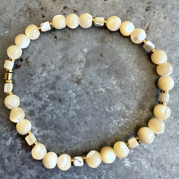 Il se compose de perles rondes de 6 mm en coquillage jaune, de cylindres en nacre blanche au doux éclat irisé, et de rondelles en hématite dorée qui viennent souligner l’ensemble avec une touche lumineuse. Monté sur un fil élastique cristal discret et solide, il s’ajuste à un poignet de 17 à 18,5 cm – avec possibilité de réglage personnalisé sur simple demande.