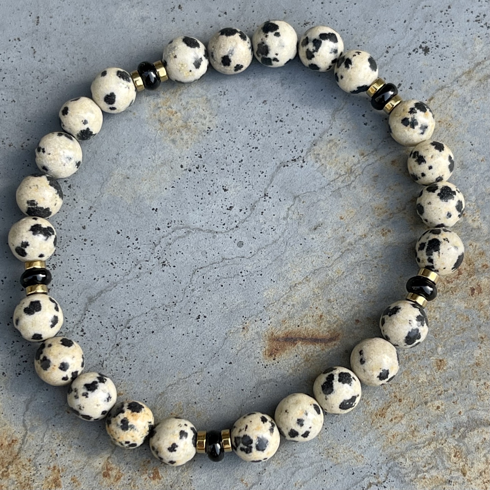 Bracelet en jaspe dalmatien, palets facettées 6 mm, rondelles en agate noire et en hématite dorée.