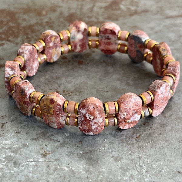Bracelet  ISPAHU en jaspe léopard rose, perles facettées 15 x 9 mm, rondelles en jaspe sésame rose et en hématite dorée. Le modèle que vous recevrez est celui de la photo…