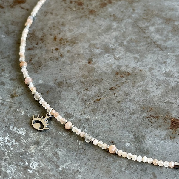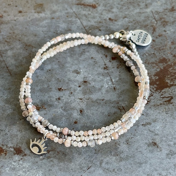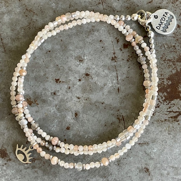 Bracelet triple tours YAMNI en pierre de lune multicolore, perles facettées 2 mm, rondelles en hématite argentée, pendentif oeil en acier chirurgical. Le plus de ce modèle qui mesure environ 53 cm c’est que vous pouvez également le porter en collier..