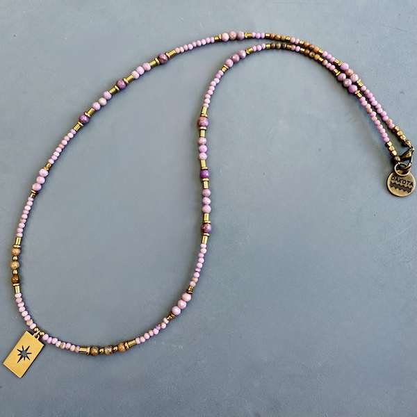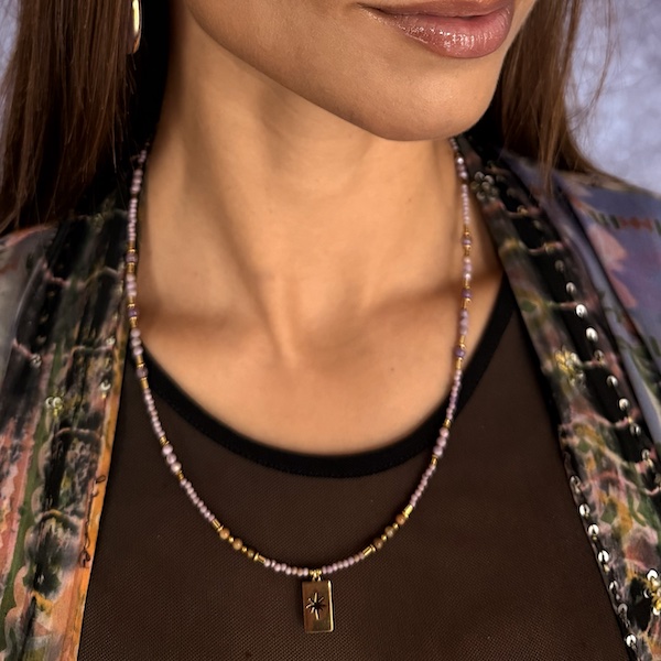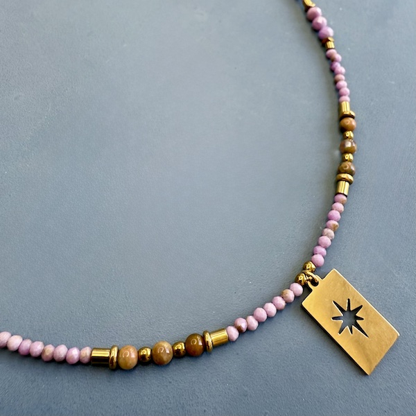 C’est un collier très fin de 53 cm en mica lépidolite qui peut également se porter en bracelet triple tours, perles facettées 2 mm, perles en hématite dorée,  pendentif rectangulaire 1,5 cm en acier chirurgical plaqué or avec étoile évidée.