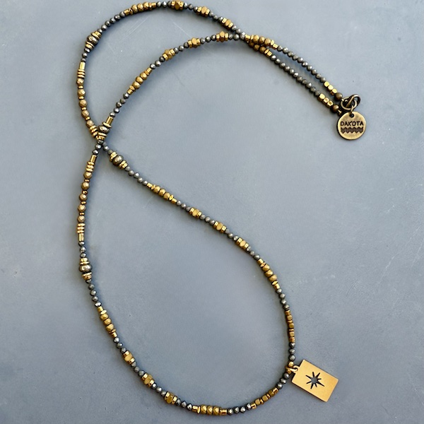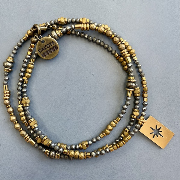 Il associe des perles facettées de 2 mm en pyrite, à la brillance naturellement dorée, à des perles en hématite dorée, pour accentuer l’éclat du bijou.