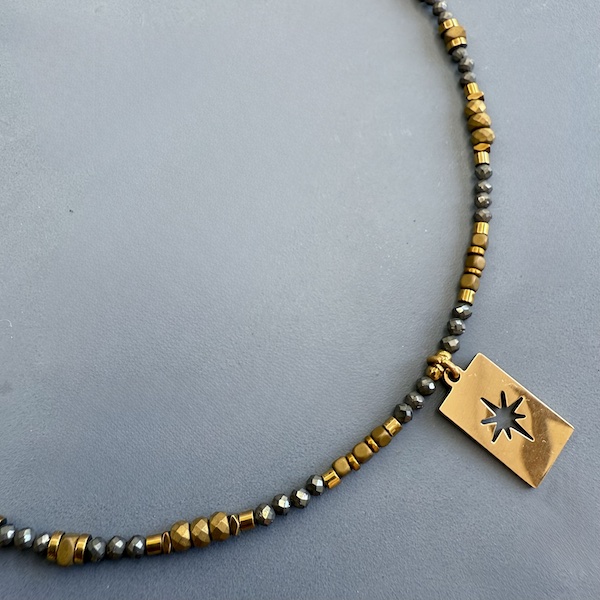 Collier très fin de 53 cm en pyrite qui peut également se porter en bracelet triple tours, perles facettées 2 mm, perles en hématite dorée,  pendentif rectangulaire 1,5 cm en acier chirurgical plaqué or avec étoile évidée.