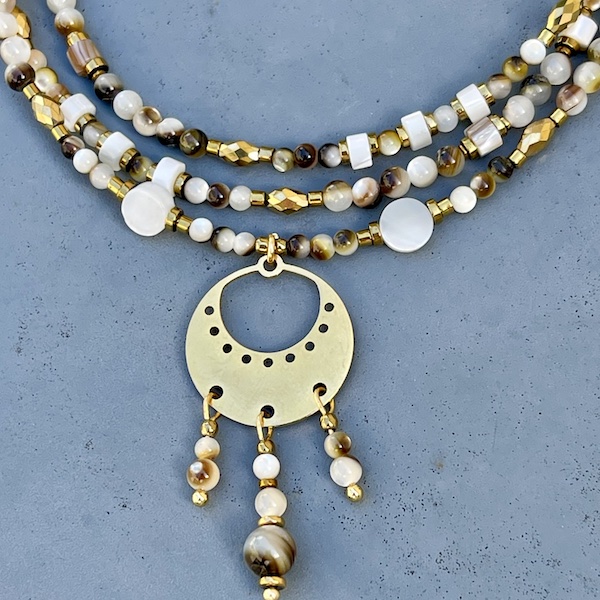 Longueur 70 cm. Pendentif à pampilles en nacre et en acier chirurgical doré 3,5 cm.