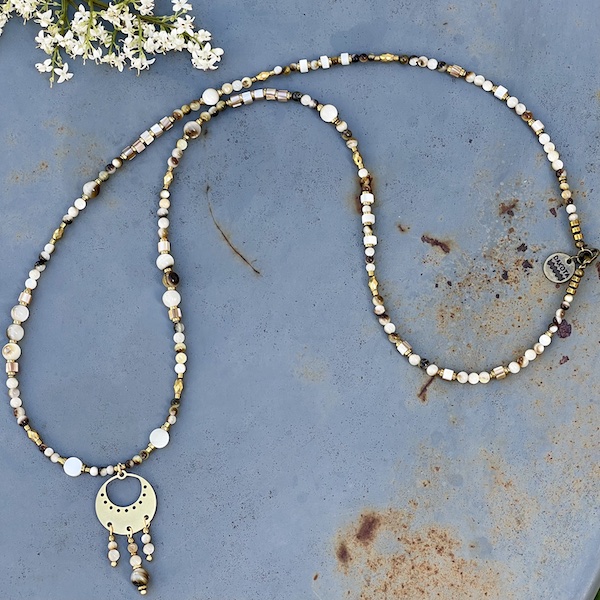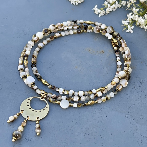 Collier 70 cm de long en nacre. Perles rondes 3 et 4 mm et pendentif à papilles en nacre et en acier chirurgical plaqué or. Associez le à un collier TOPA ou NATAKE pour un joli effet de superposition ou à un modèle plus long pour un effet très bohème…