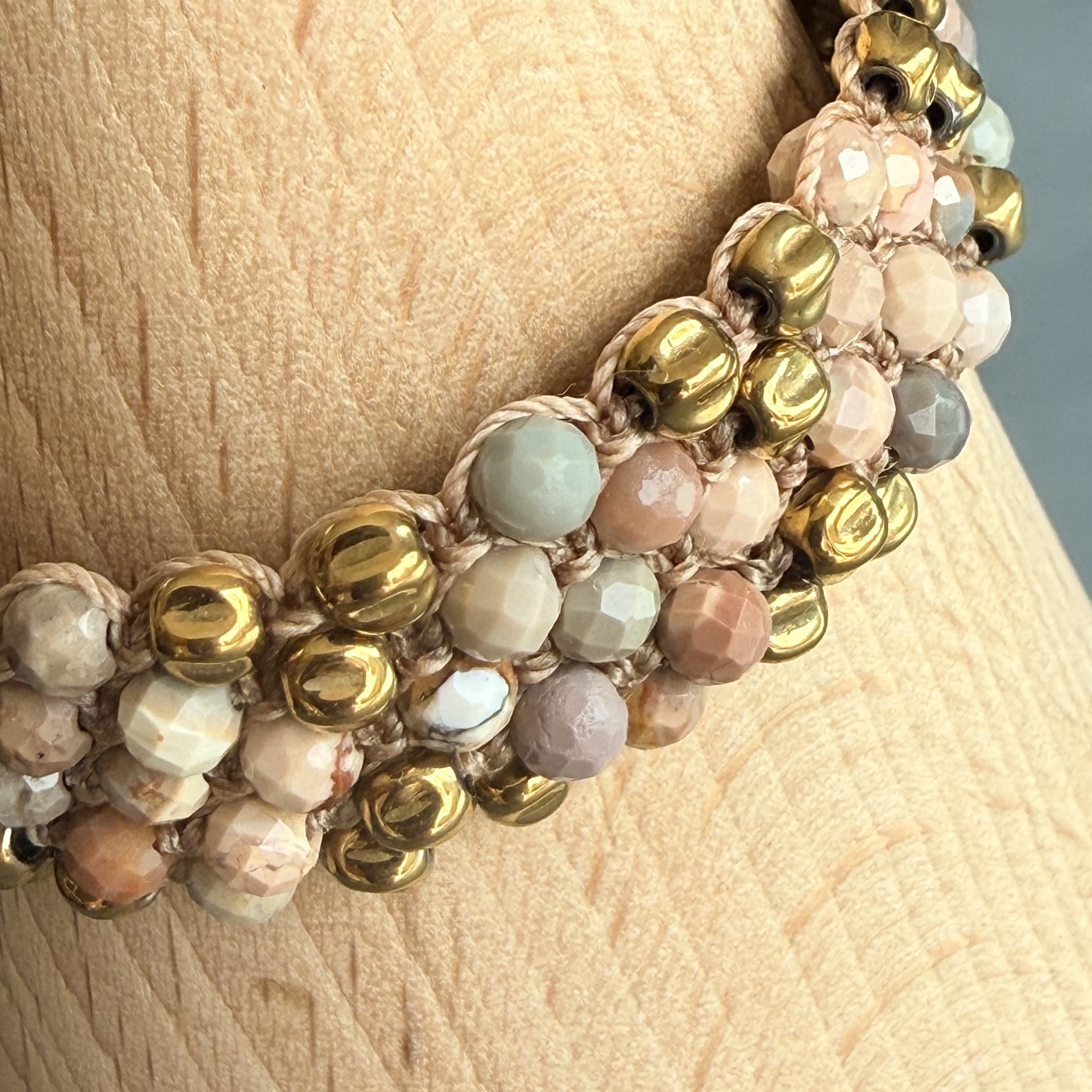 La manchette est réalisée avec des perles facettées de 4 mm en agate pastel, dont les nuances douces apportent une touche de délicatesse et de lumière. Les facettes des pierres captent subtilement la lumière, créant un éclat discret qui souligne la finesse du bijou. Les teintes pastel de l’agate, allant du rose poudré au beige clair, parfois légèrement bleutées, évoquent la douceur et l’harmonie.