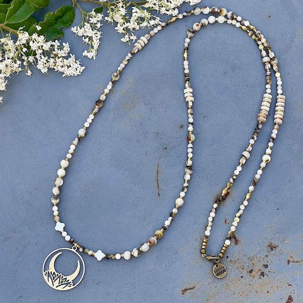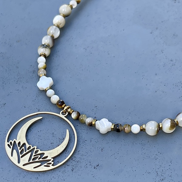 Grand collier 93 cm de long en nacre perles rondes 3, 4 et 6 mm. Pendentif en acier chirurgical plaqué or 4 cm. Associez le à d’autres longueurs pour un effet très bohème…