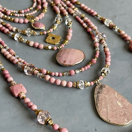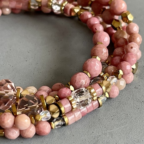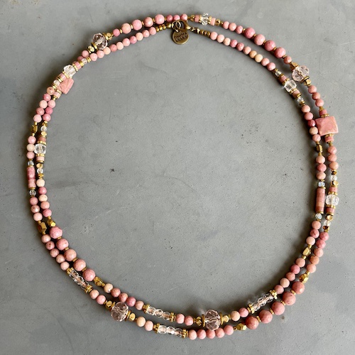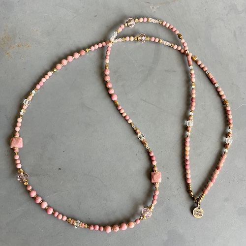 Monté sur un double fil cablé, ce collier est conçu pour garantir confort et solidité tout en restant léger et agréable à porter. Chaque perle de rhodonite, de cristal de Bohème et d’hématite dorée a été soigneusement sélectionnée pour offrir une qualité exceptionnelle et un éclat subtil. Ce design sans pendentif permet une grande liberté de style, en s’adaptant à toutes vos envies.