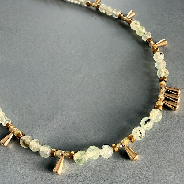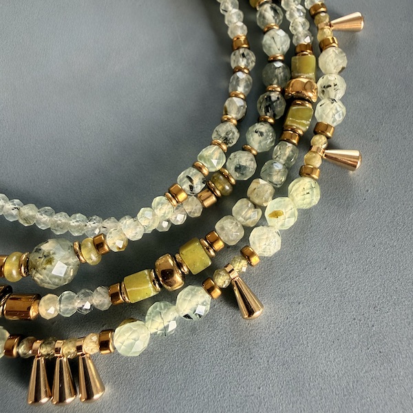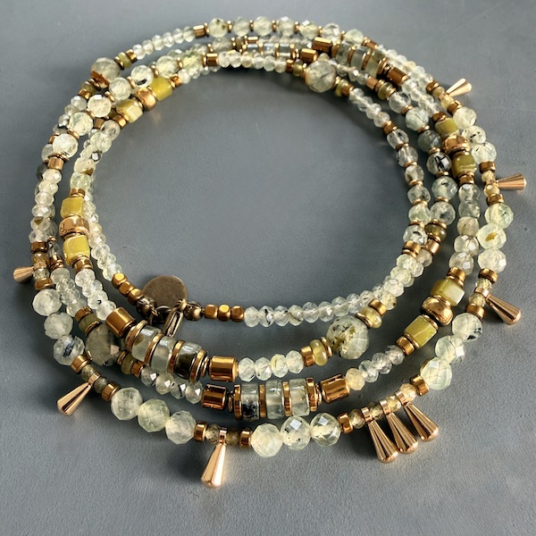 Les perles en jade viennent enrichir la composition avec leurs teintes naturelles et profondes. Le jade, pierre emblématique notamment en Asie, est symbole de sagesse, d’harmonie et de prospérité depuis des millénaires. Il est reconnu pour favoriser la paix intérieure et attirer des énergies positives, créant une belle complémentarité avec la préhnite.