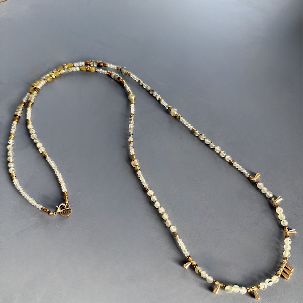 Long sautoir TANKA 109 cm en préhnite, perles facettées 4 et 6 mm. Perles en jade et en hématite dorée. petites papilles gouttes en acier chirurgical plaqué or. Ce modèle peut être porté long ou double. C’est une pièce unique qui peut se porter seule ou associée à des modèles de longueurs différentes: SLOWLIA, COKATA ou NAPYUKA pour un effet très bohème chic…